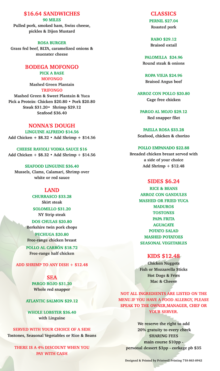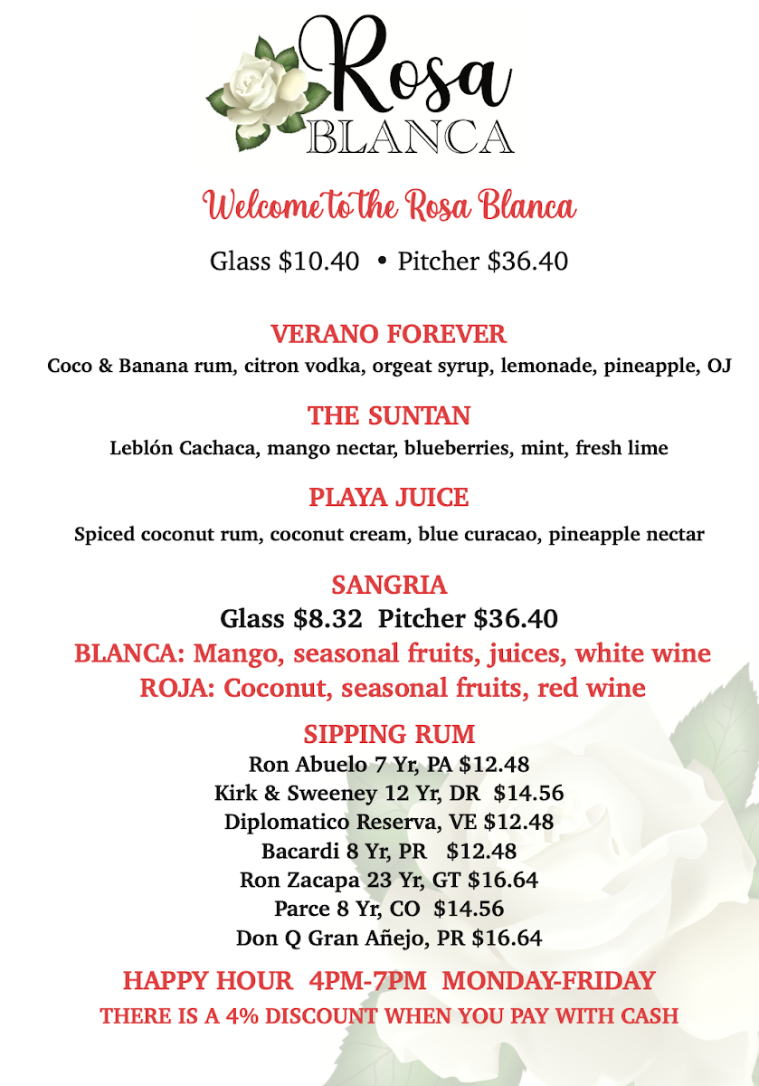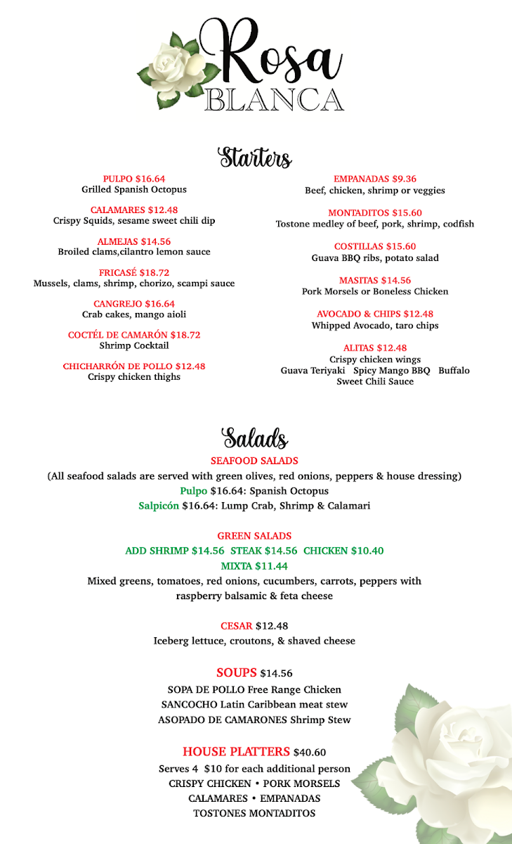 If you’re in the Bronx and craving a delicious meal in a welcoming atmosphere, look no further than Rosa Blanca Bar & Grill. Located at 3005 Middletown Rd, this cozy spot offers a menu full of flavorful dishes, perfect for every occasion. Whether you’re in the mood for a hearty burger, fresh seafood, or something with a little Latin flair, you’ll find plenty of tasty options to satisfy your appetite. The Rosa Blanca Bar & Grill Menu is crafted with a mix of classic comfort foods and exciting new takes, making it easy to find something you’ll love. From appetizers that will leave you wanting more to entrees that will have you coming back for seconds, every bite promises to be a treat. With a relaxed vibe and great service, it's the kind of place where you can kick back, enjoy a meal, and spend quality time with friends and family.